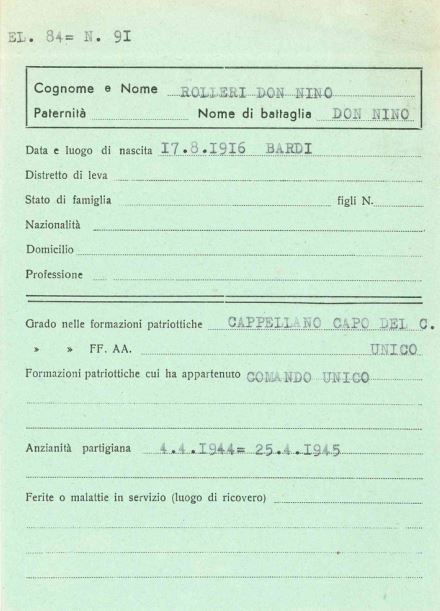 “Don Nino Rolleri, born on August 17, 1916 in Varsi, in the province of Parma, was a partisan priest from the Parma mountains. He was part of the Parma Single Command from April 4, 1944 to April 25, 1945 and was chaplain of the 31st Garibaldi Brigade, Val Ceno Division.” – Provincial Committee of the A.N.P.I. of Parma (https://anpiparma.it/pietre-della-memoria/canonica-di-specchio/)