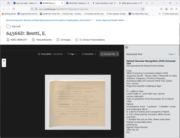 Wow! So 62 results for “don nino rolleri”. But jumping out at me from that first one at the top are the words (yup you got it!) Allied Screening Commission (Italy). But who the hell is Beotti, E.? Nothing for it but to Click on the Link!