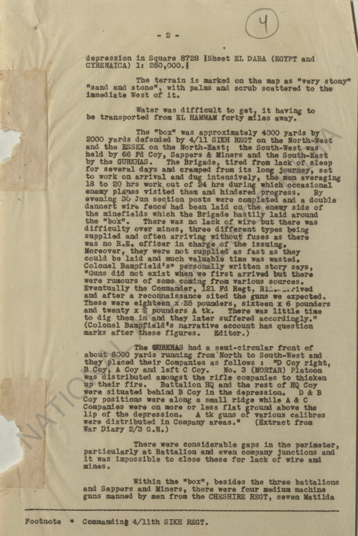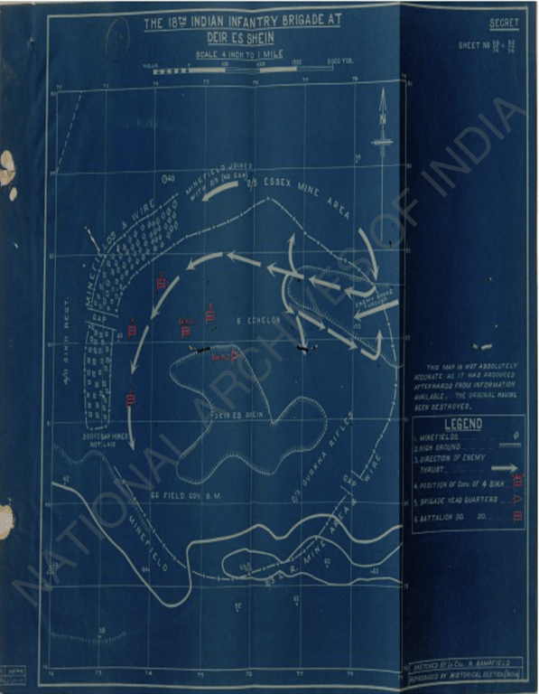 “As for the 18th Brigade at Deir el Shein, the 4/11th Sikhs were on the NW of the box, the 2/5 Essex on the NE, the 2/3 Gurkhas on the E in a semi circle, and the 66th Field Company of Sappers & Miners on the SW. They were supported by 7 Matildas of the 42nd Royal Tank Regiment, 4 medium machine guns of the Cheshire Regiment, 2-pounders and 6 pounders manned by South African and Welsh units. Oh, and the 32nd Field Ambulance had an Advanced Dressing Station too. Sorry, I don’t really remember all the other units outside of the main battalions of the 18th Brigade since there was a huge mess in setting up the box, the 18th Brigade had no signal equipment, very little ammunition, and the supporting artillery came in too late and because the area of Deir el Shein was bedrock, there was not enough time to dig the guns in. As for the result of the battle, the Sikhs were overrun at 1730 hours, the Gurkhas at 1900 hours and Essex by 1930 hours. The Sikhs lost 3 officers and 370 other ranks with 7 officers and 500 other ranks missing. The Gurkhas lost 12 officers and 580 men, not sure of how many missing, but their commanding officer was captured.” – by DocAmerica Sun Aug 28, 2011: Moderator John W. Howard