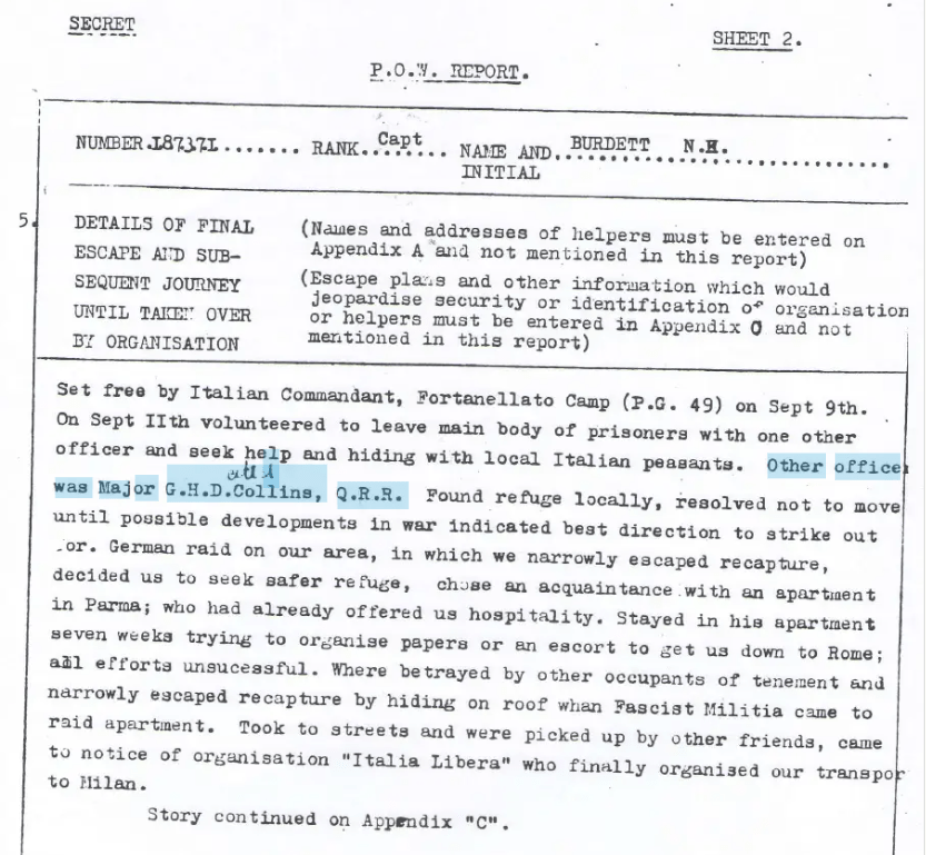 My immediate thought when I received this correspondence was that I needed to see if Nigel’s father appeared on my site, but a quick search drew a blank, which I thought was odd. So, I decided to search for his “fellow prisoner Noel Burdett” and I was quite surprised to find that I had previously stumbled upon his story under the Monte San Martino Trust Archives. And sure enough, a quick search on that story indicated that a Major G.H.D Collins. Q.R.R. [Queens Royal Regiment] had been a travelling companion of Noel Burdett following the release of the POW’s from PG 49 at Fontanellato at the time of the Italian Armistice. Surely this must be Nigel’s father? So, I wrote back to Nigel with my find, thanking him for reaching out to me about his Dad:-