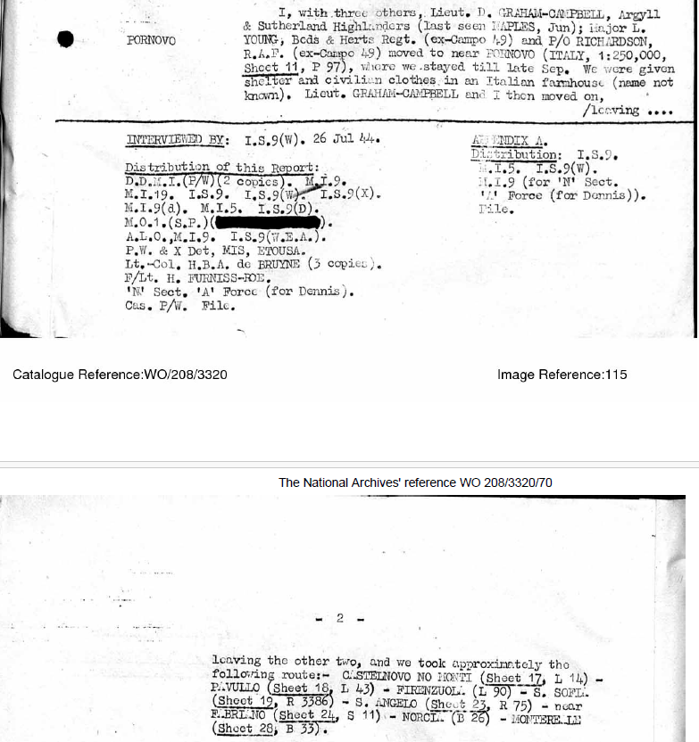 “I, with three others, Lieut. D. GRAHAM-CAMPBELL, Argyll & Sutherland Highlanders (last seen NAPLES, Jun); Major L. YOUNG, Beds & Herts Regt. (ex-Campo 49) and P/O RICHARDSON R.A.F. (ex-Campo 49) moved to near PORNOVO (ITALY, 1:250,000, Sheet 11, P 97), where we stayed till late Sep. We were given shelter and civilian clothes in an Italian farmhouse (name not known). Lieut. GRAHAM-CAMPBELL and I then moved on, leaving the other two, and we took approximately the following route:- CASTELNOVO NO MONTI (Sheet 17, L14) – PAVULLO (Sheet 18, L 43) – FIRENZUOLA (L 90), – S. SOFIA (Sheet 19, R 3386) – S. ANGELO (Sheet 23, R 75) – near FABRIANO (Sheet 24, S 11) – NORCIA (B 26) – MONTEREALE (Sheet 28, B 33).”