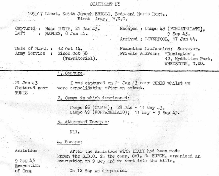 Name: 105517 Lieut. Keith Joseph Briggs. Unit: Bedfordshire and Hertfordshire Regiment, First Army. Captured: Near Tunis, 21st January 1943. Escaped: Campo 49 (Fontanellato), 9th September 1943. Left: Naples, 8th June 1944. Arrived: Liverpool, 17th June 1944. Date of Birth: 12th October 1914. Army Service: Since October 1938 (Territorial). Peacetime Profession: Surveyor. Private Address: “Donington”, 12, Myddelton Park, Whetstone, N.20.