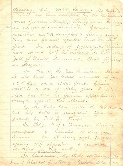 Then we all sat round the parlour table for the evening news bulletins; first the “Voice of America” in Algiers and the BBC in London at 8.30 and 9.00 pm respectively. “Ascoltate la voce del America, una delle Nazione Unite. Ecco le ultime notizie.” Then to our even greater excitement we heard the strokes of Big Ben and the familiar tones of the BBC news reader: “This is the BBC Home and Overseas Service. Here is the 9 o’clock news and this is—reading it.”