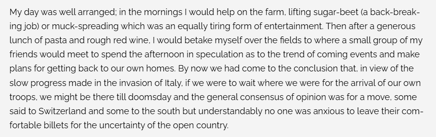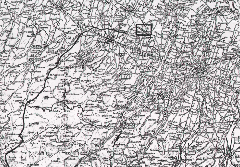 And, interestingly for me, this story parallels a similar start to my own father’s ‘Long Walk from Fontanellato’ as the route passes through much of the same countryside heading south west after crossing the main road between Parma and Milan and bypassing Fidenza and passing close by the villages of Villora and Varsi, both destinations my Mum and Dad visited in 1952.