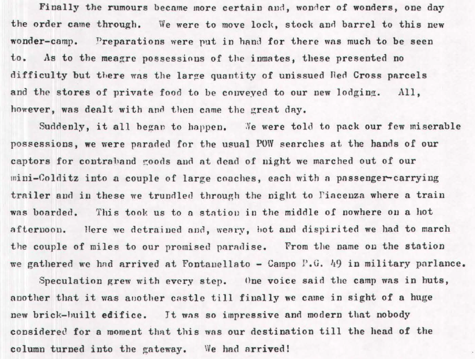 His story continues indicating that, in the Spring of 1943 he along with some 100 others was moved out to Piacenza by coach and then to Fontanellato by train –