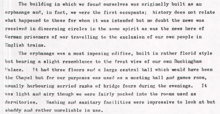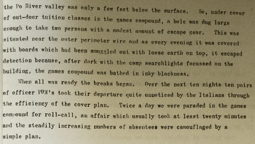 And later on in his story he describes the building and even goes on to talk about the “Great Escape” from the playing fields in which he seems to indicate that as many as 20 officers used the route to escape into the Italian countryside.
