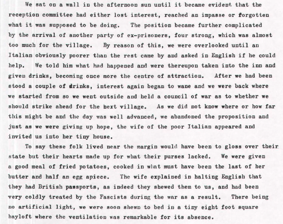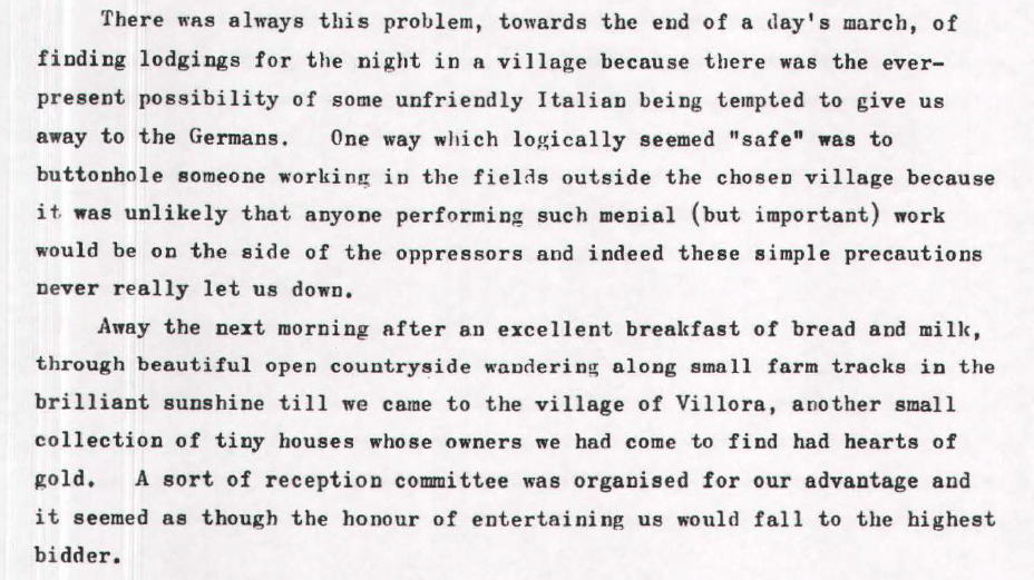 Contained deep in the Archives of the Monte San Martino Trust is a very interesting description of the escape from PG 49 at Fontanelato written by John Langrishe, a Lieutenant with the 25/26 Battery of 7th Medium Regiment Royal Artillery, entitled “The Long Walk Out” which describes in his own words the events that took place after the Italian Armistice from September to November 1943. And, a few days after leaving the comfort of the Orphanage, he describes life on the outside.
