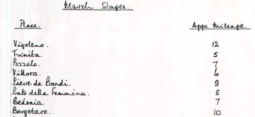 John then separates to stay on his own with a farmer called Maestri and his family before finally, on 30th September, he joins up with ‘Buck’, John and ‘Bunny’ and they head southwest across the Via Emilia, first skirting Fidenza and on to Vigoleno, Trinita, Pozzolo and Villora before continuing on to Bardi and beyond.