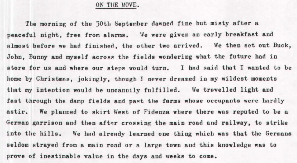 Contained deep in the Archives of the Monte San Martino Trust is a very interesting description of the escape from PG 49 at Fontanellato written by John Langrishe, a Lieutenant with the 25/26 Battery of 7th Medium Regiment Royal Artillery, entitled “The Long Walk Out” which describes in his own words the events that took place after the Italian Armistice from September to November 1943.