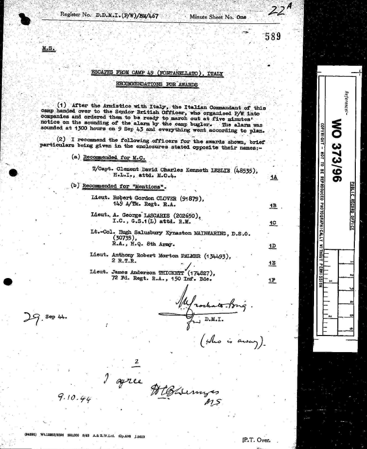 It’s extraordinary how often I seem to be nudged by my friends at WW2Talk to look into a subject that is related to PG 49 at Fontanellato. None more so than when I recently stumbled upon a Thread entitled “Award Military Cross, C.D.C.K. Leslie, 2nd Highland Light Infantry attached MO4, camp 49 Italy“