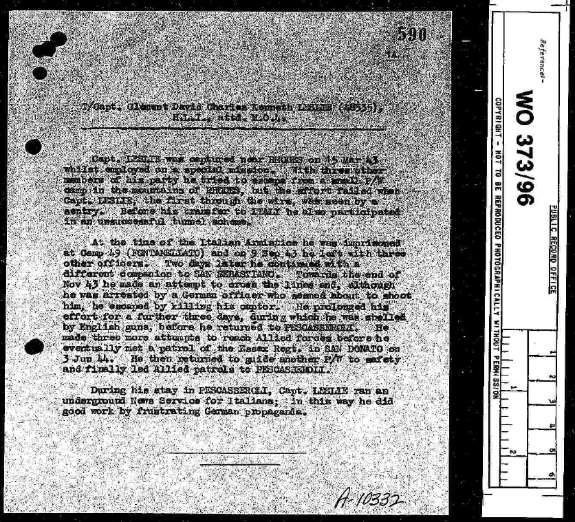 “Capt. LESLIE was captured near RHODES 15th March 1943 whilst employed on a special mission with three other members of his party he tried to escape from a small P/W camp in the mountains of RHODES, but the effort failed when Capt. LESLIE, the first through the wire, was seen by a sentry. Before his transfer to ITALY he also participated in an unsuccessful tunnel scheme.