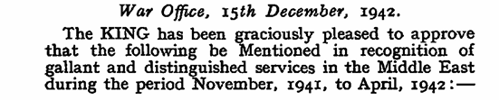 The KING has been graciously pleased to approve that the following be Mentioned in recognition of gallant and distinguished services in the Middle East during the period November, 1941, to April, 1942: —
