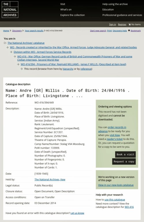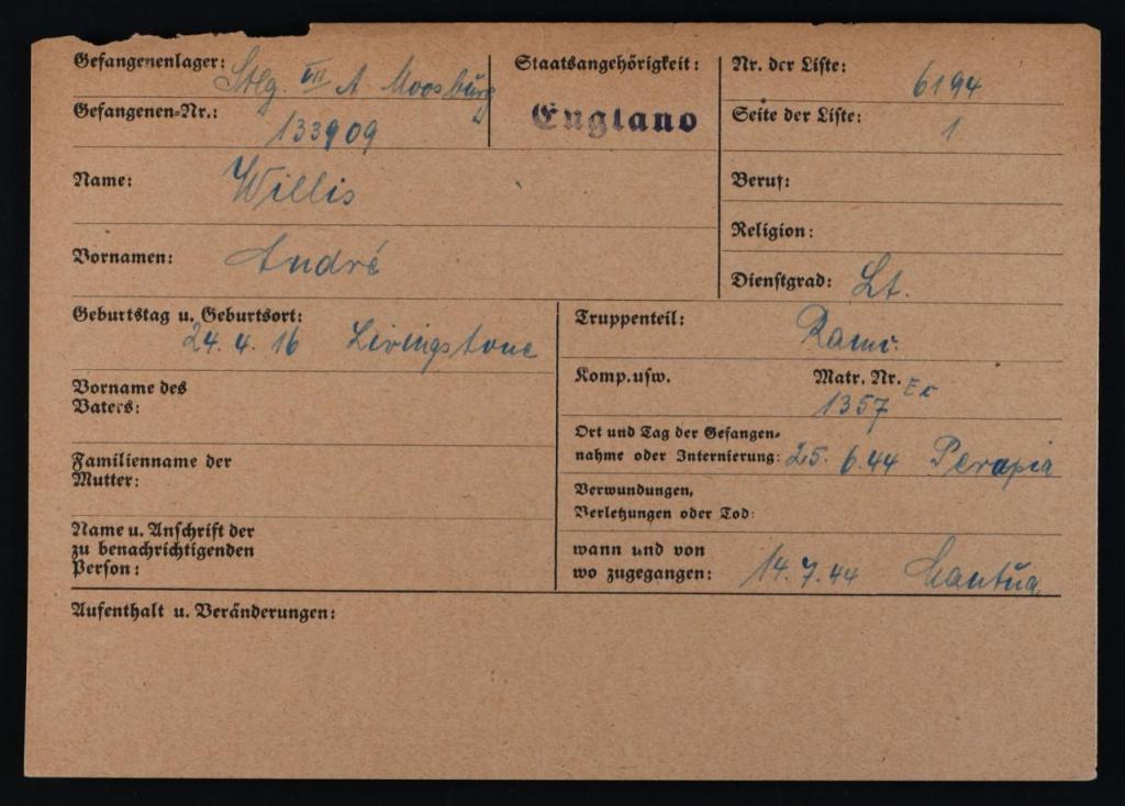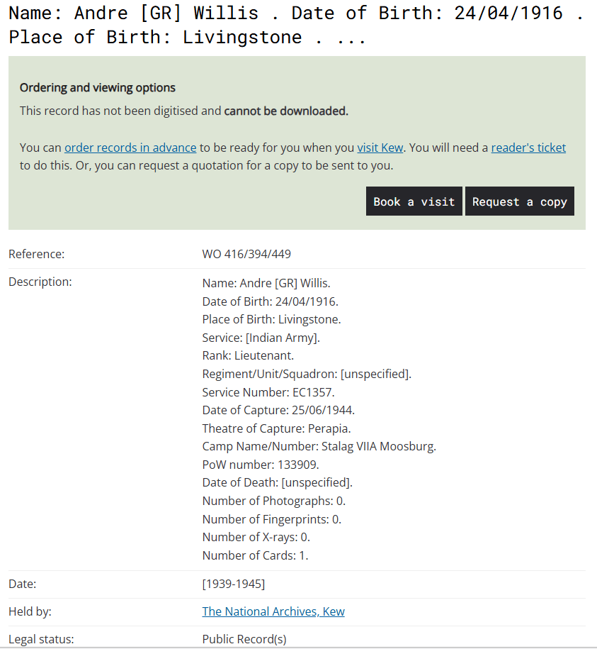 Name: Andre [GR] Willis. Date of Birth: 24/04/1916. Place of Birth: Livingstone
