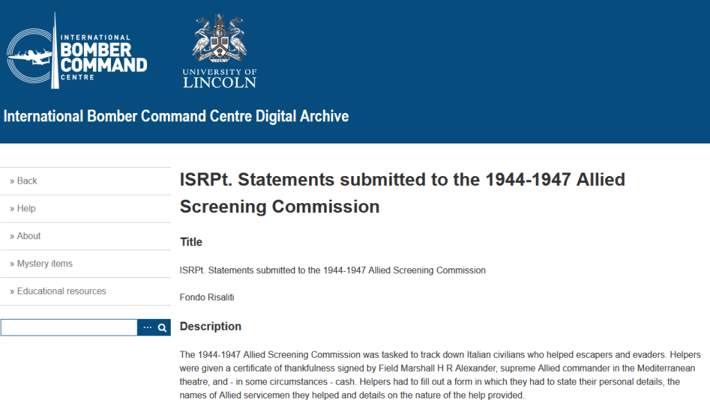 “The 1944-1947 Allied Screening Commission was tasked to track down Italian civilians who helped escapers and evaders. Helpers were given a certificate of thankfulness signed by Field Marshall H R Alexander, supreme Allied commander in the Mediterranean theatre, and – in some circumstances – cash. Helpers had to fill out a form in which they had to state their personal details, the names of Allied servicemen they helped and details on the nature of the help provided.”