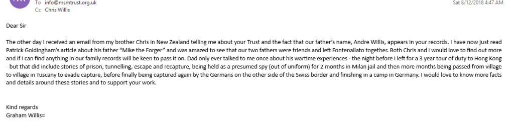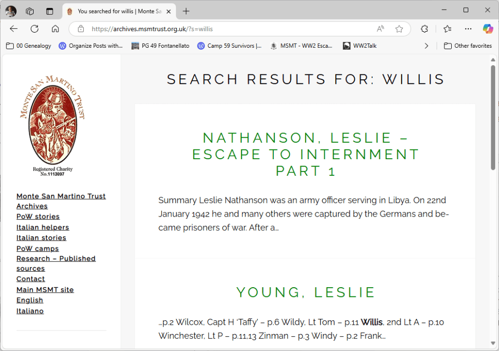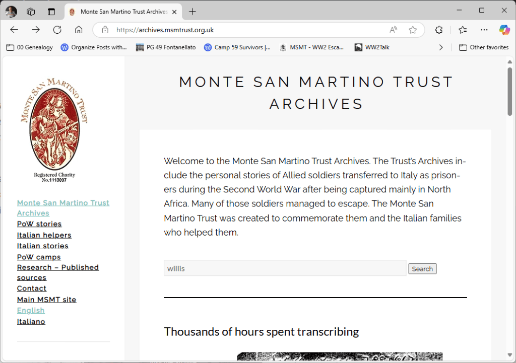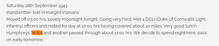One of the first “finds” that I had when I started researching my father’s wartime story was shortly after I had come across the Monte San Martino Trust and, after telling my brother Graham about the Trust, he very soon responded after he decided to use their Search Engine and had typed in willis:-