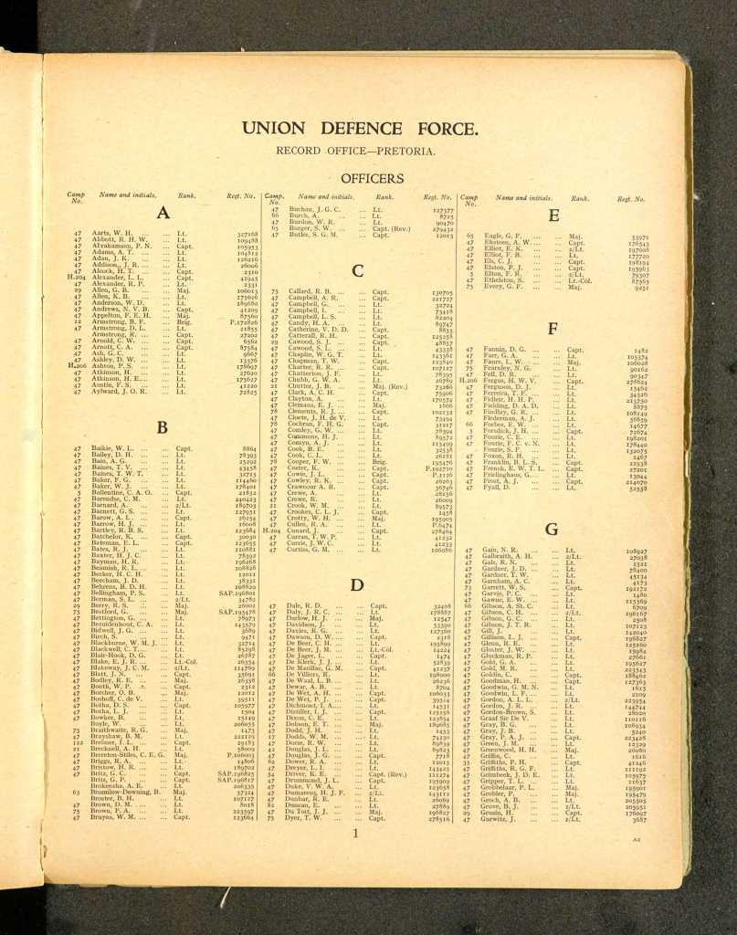 | 1 | Whyte | D.R.D. | Lt. | 123974 | Union Defence Forces |