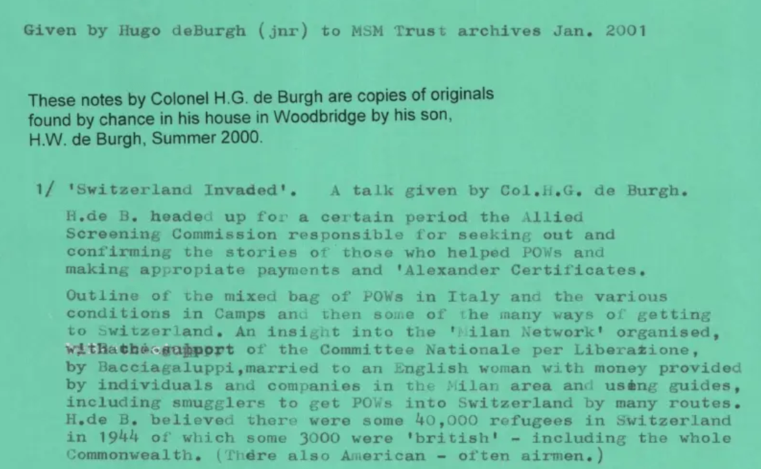 Outline of the mixed bag of POWs in Italy and the various conditions in Camps and then some of the many ways of getting to Switzerland. An insight into the ‘Milan Network’ organised, with the support of the Committee Nationale per Liberazione, by Bacciagaluppi, married to an English woman with money provided by individuals and companies in the Milan area and using guides, including smugglers to get POWs into Switzerland by many routes. H. de B. believed there were some 40,000 refugees in Switzerland in 1944 of which some 3000 were ‘British’ – including the whole Commonwealth. (There are also American – often airmen.)”Switzerland Invaded