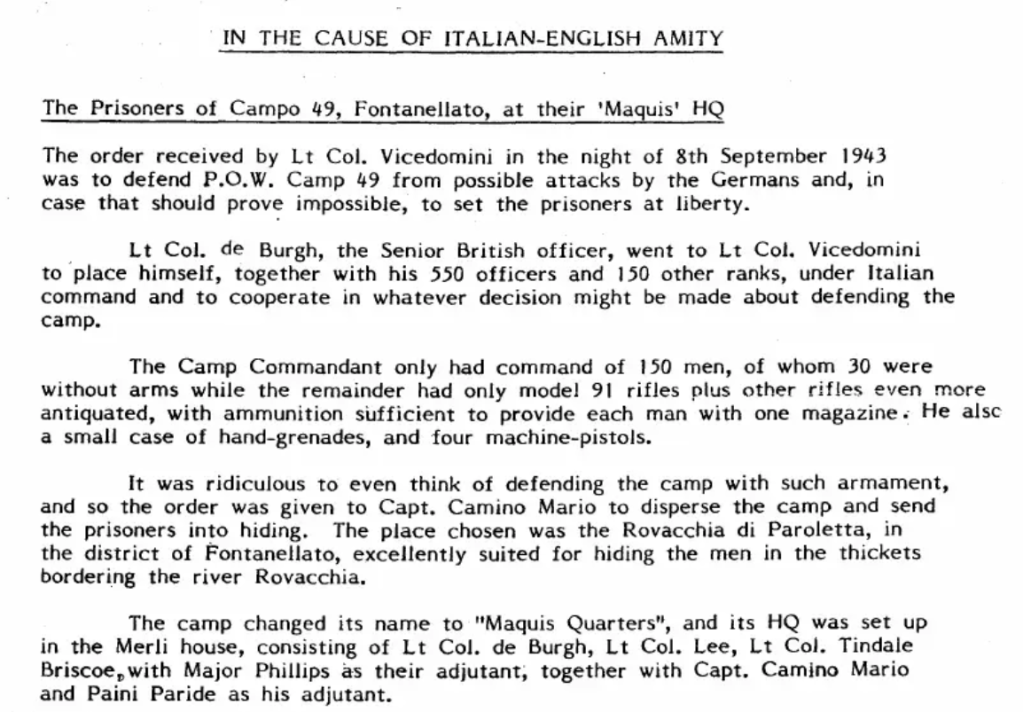 Another factor in the confusion was the British War Office’s instruction to prisoners of war to stay put. By contrast the Badoglio Government instructed camp commanders to let the prisoners of war out, an instruction many camp commanders obeyed, whilst some did not. In Fontanellato, the Italian Commander, Colonello Vicedomini, defied the Germans and released the prisoners of war. For this act he was sent to a German concentration camp.