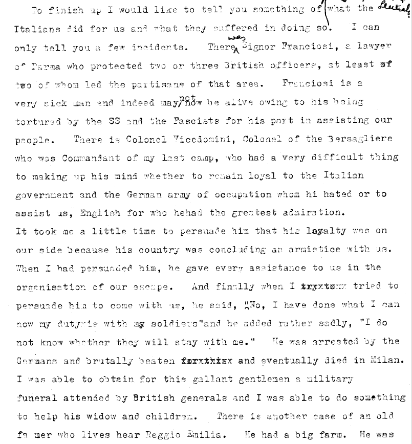 ” It took me a little time to persuade him, he gave every assistance to us in the organisation of our escape. And finally when I tried to persuade him to come with us, he said ‘No, I have done what I can now my duty is with my soldiers’ and he added rather sadly ‘I do not know whether they will stay with me.’ He was arrested by the Germans and brutally beaten and eventually died in Milan.” …. after being released from Mauthausen Concentration Camp in Austria after the war.