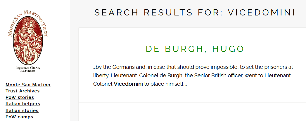 A further screenshot was taken from the same document found on the Monte San Martino Trust website that provides a Summary of Hugo de Burgh which was written by Giuseppe Sambataro and listed as an undated account of the general exit from Fontanellato.