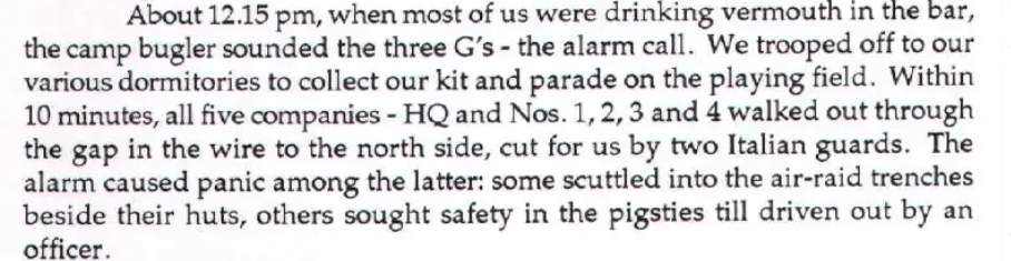 “After breakfast we were all told to parade in the courtyard. This time the SBO’s news was not so good: the Commandant expected German troops to seize the camp. He had patrols out. We were to put on our battledress, pack our kit on our beds, draw 24-hour rations and be ready to move at five minutes’ notice. He had offered our help to defend the camp but the Commandant had politely declined it.